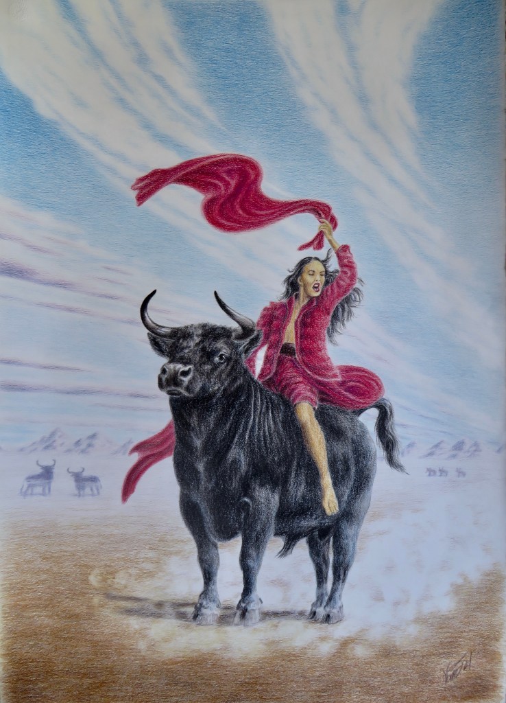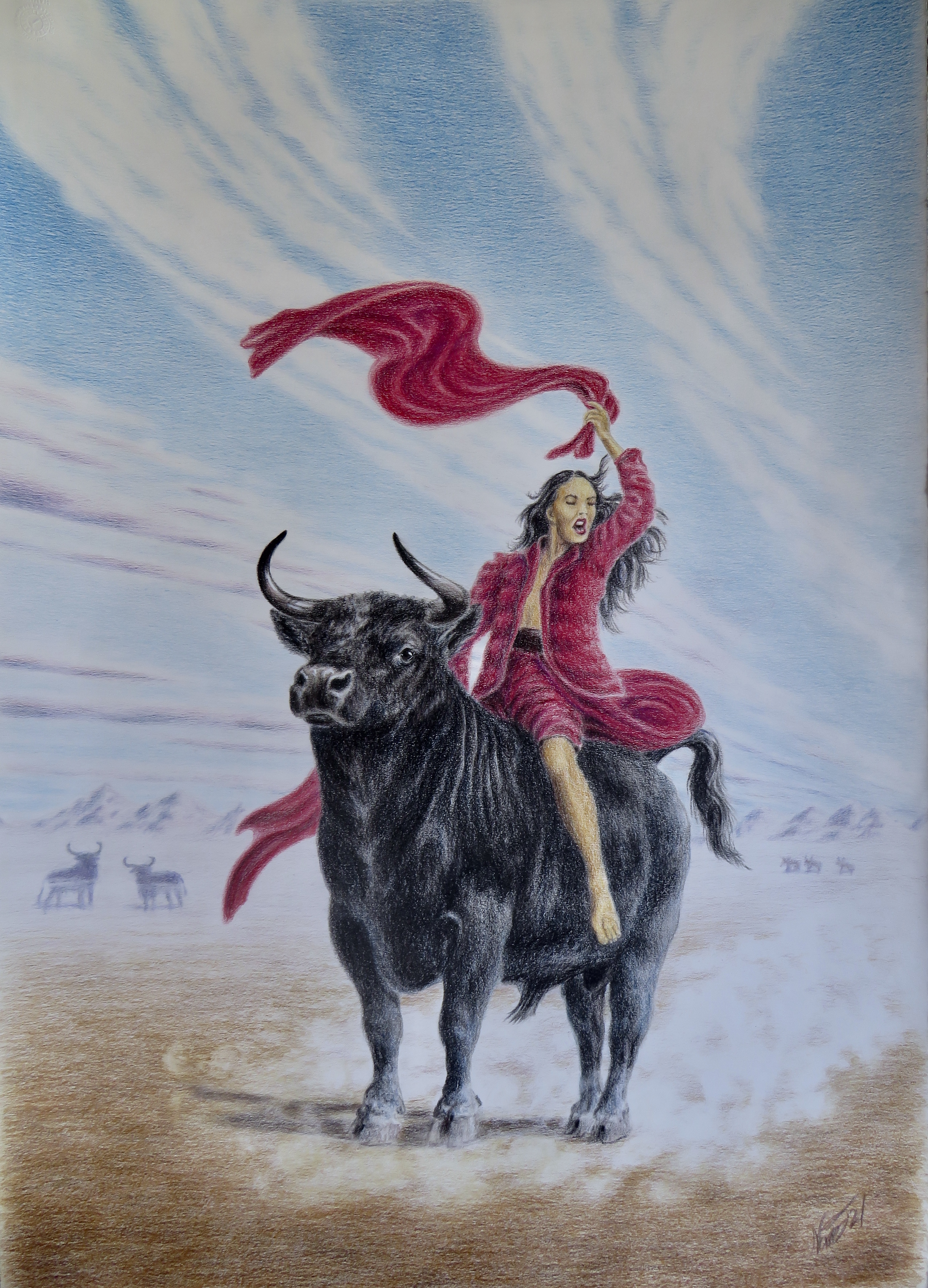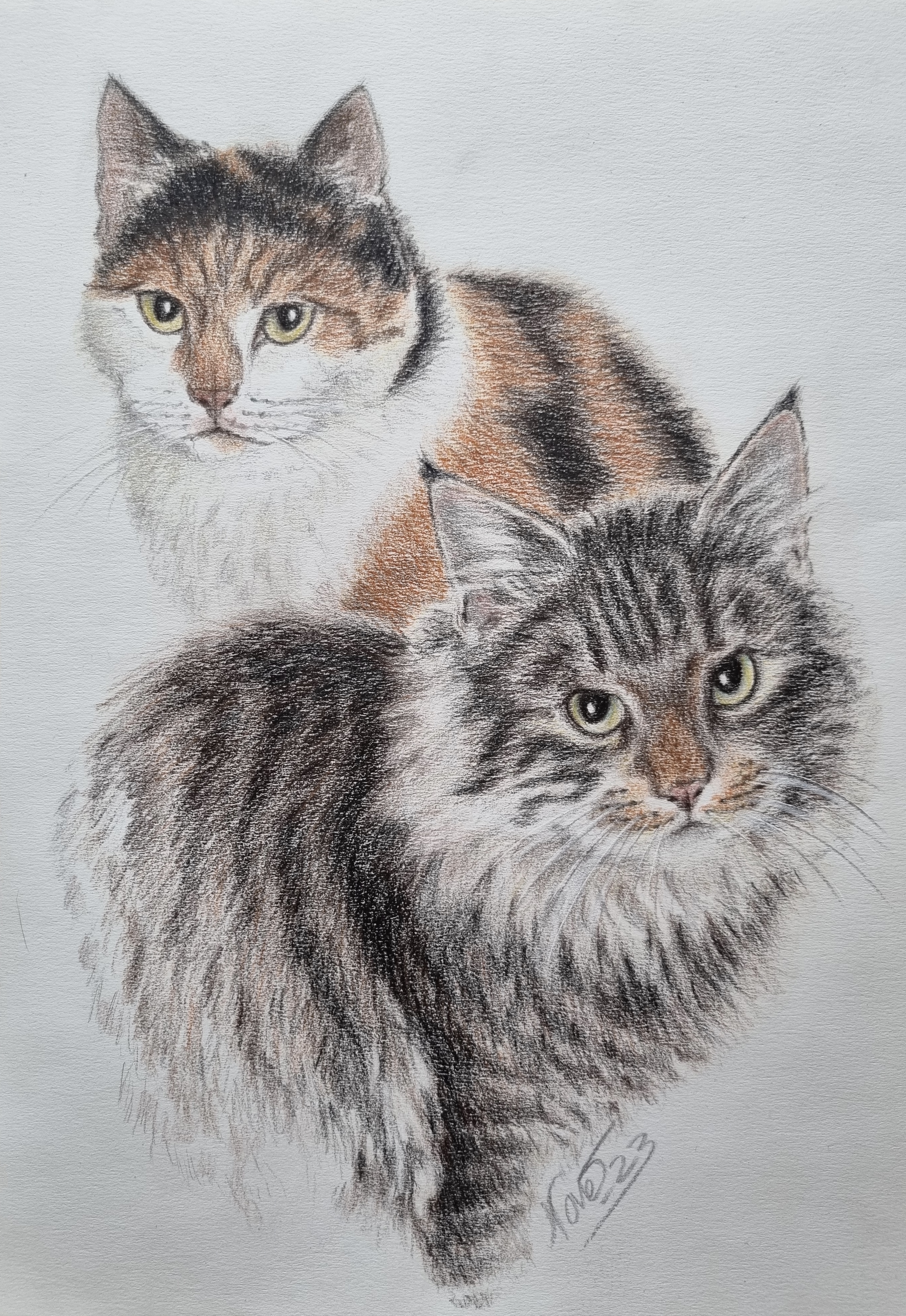 Jeg benytter lysekte fargeblyanter på tykk, syrefri bomullskartong. Størrelser fra 25×36 cm. (større enn A4) og oppover, og priser fra kr. 1900,-
