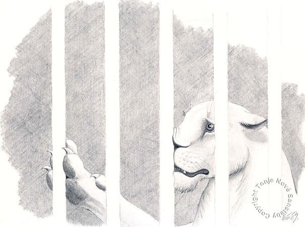 «Løvinne i bur». Blyant, 1989. «Vikinggrav». Blyant, 1989. Noe større enn A4 format. Til slags kr. 2800,- uten ramme. Inkl. ramme 3800,-