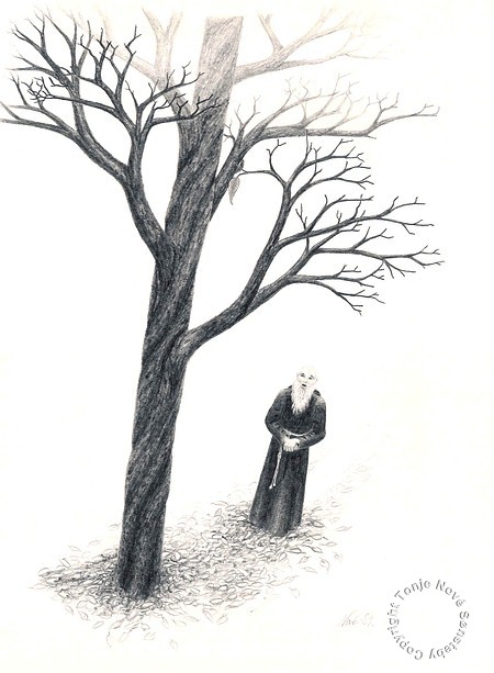 «Syngende munk». Blyant, 1989. Noe større enn A4 format. Til slags kr. 2800,- uten ramme. Inkl. ramme 3800,-