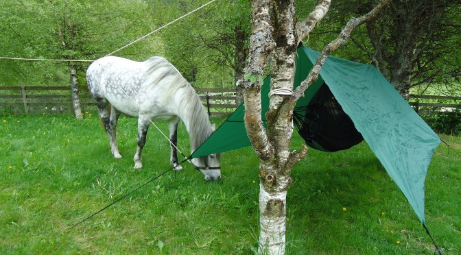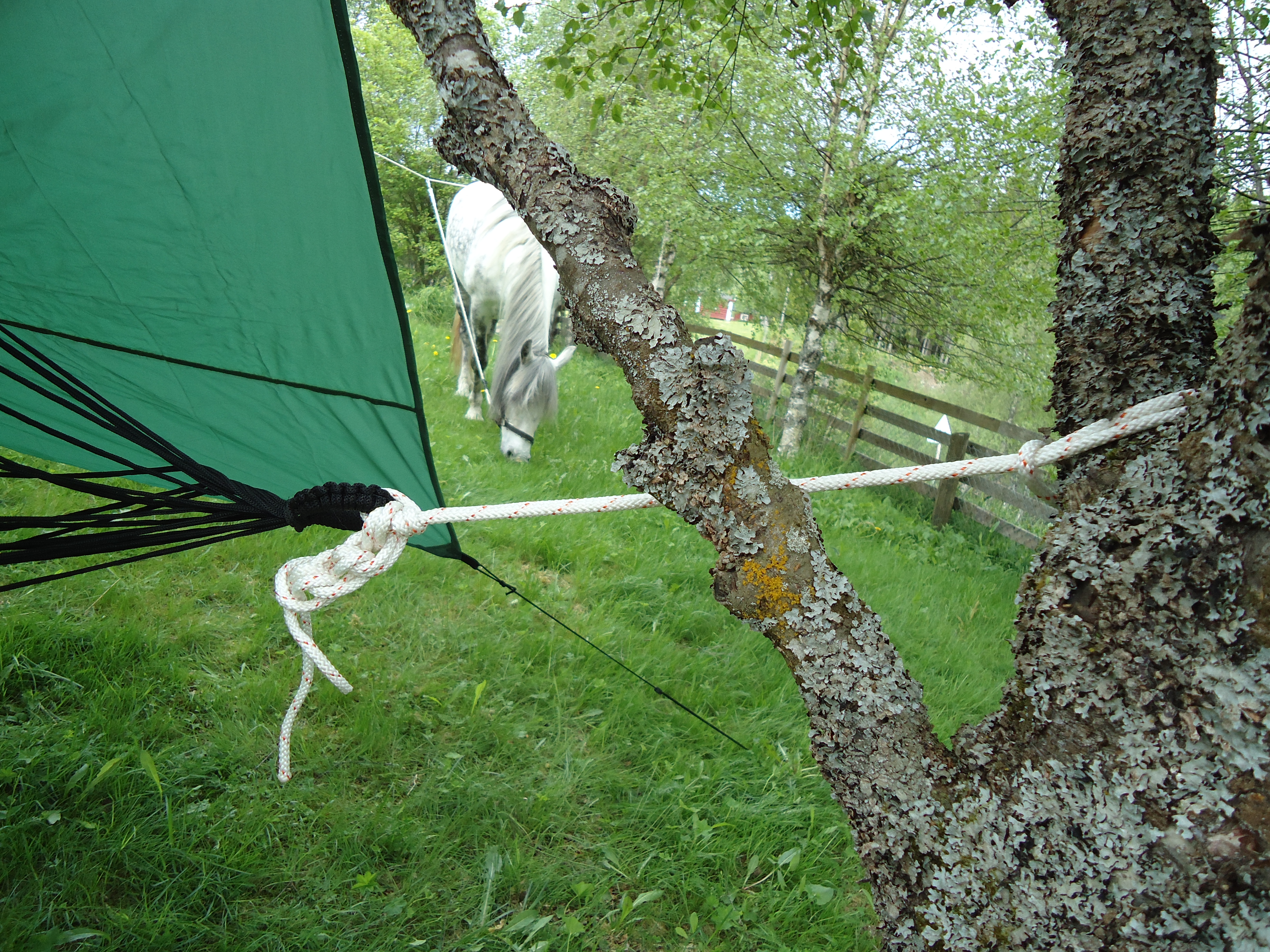 Rigget meg til i hagen mellom bjørketrærne for å teste ut denne hengekøya, med store forventninger. Ingen veiledning følger med, så her må man bare improvisere og bruke sin logiske sans. Det ser ut på reklamen som om tarpen skal slås opp diagonalt, men da det er tre hemper på to av sidene og det følger med fire barduner, virket det mer logisk at den er beregnet på å festes med barduner i 4 hjørner, og til trærne i hver ende. Dette valgte jeg så å prøve ut, se bilde under.