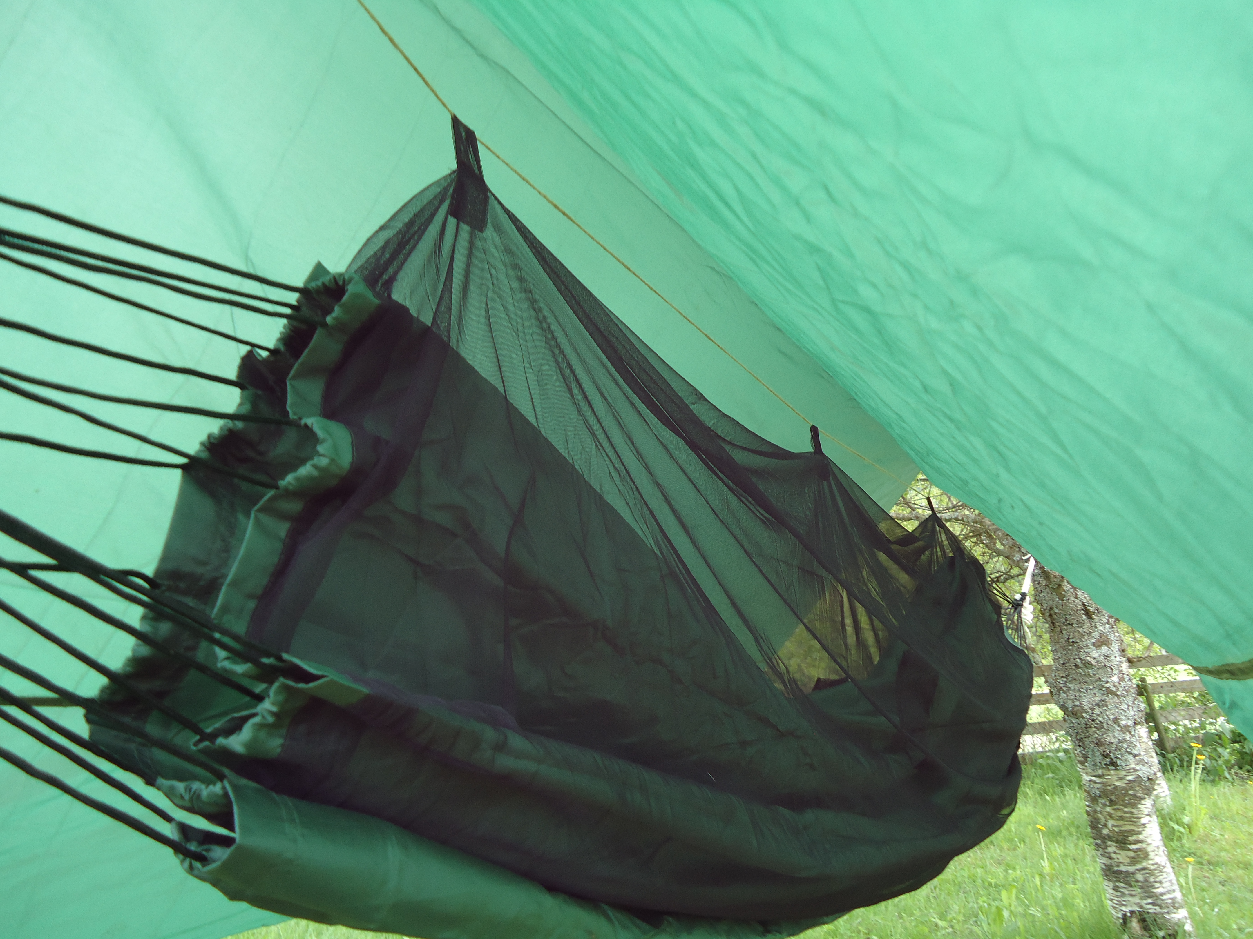 Vel, slakket snora og reparerte myggnettingen, og den ble så god som ny. Fant ut at man trenger ikke å feste mer enn den midterste hempen i myggnettingen, men jeg vil tro dette kommer an på hvor lang avstand det er mellom trærne som hengekøya er festet i. Jo tettere sammen dess mer vil hengekøya synke, og jo lenger fra hverandre dess strammere vil køya henge og den vil synke mindre.