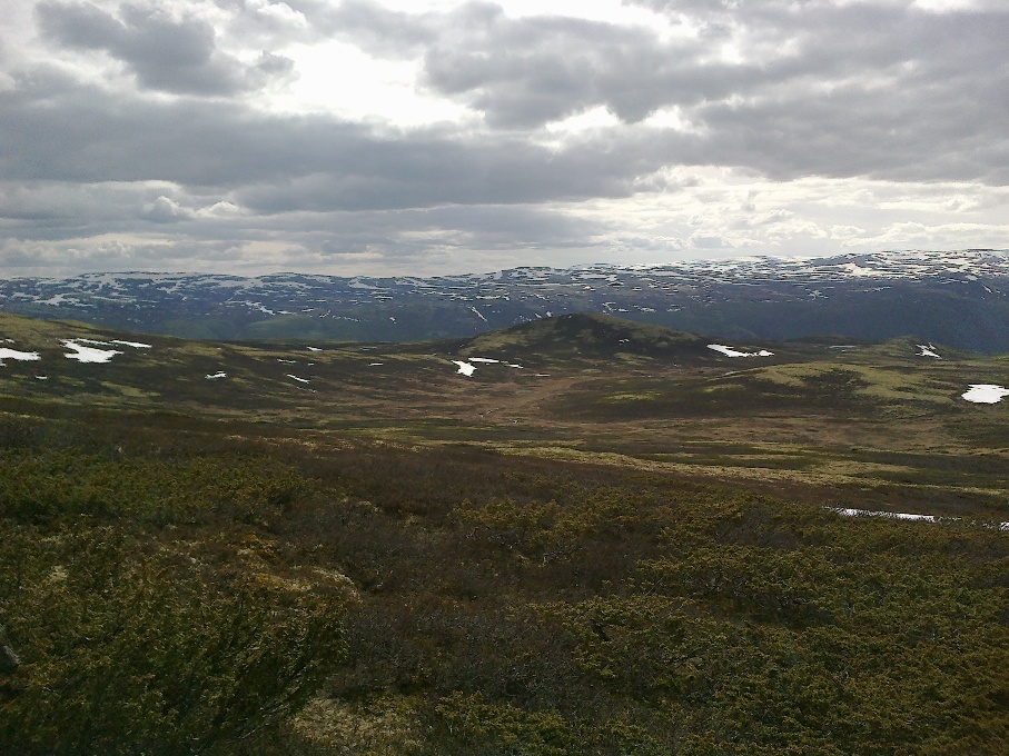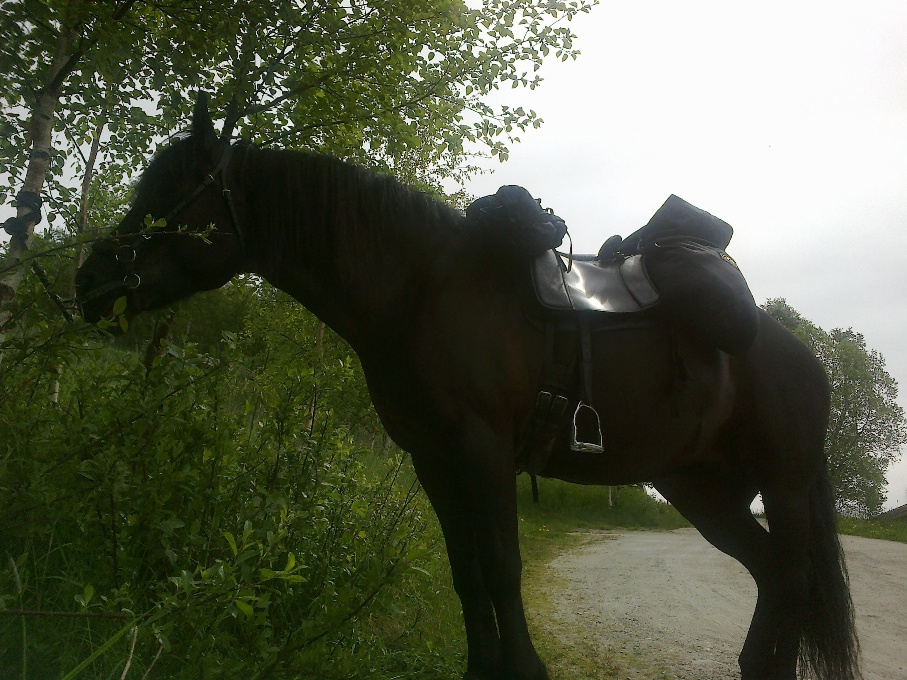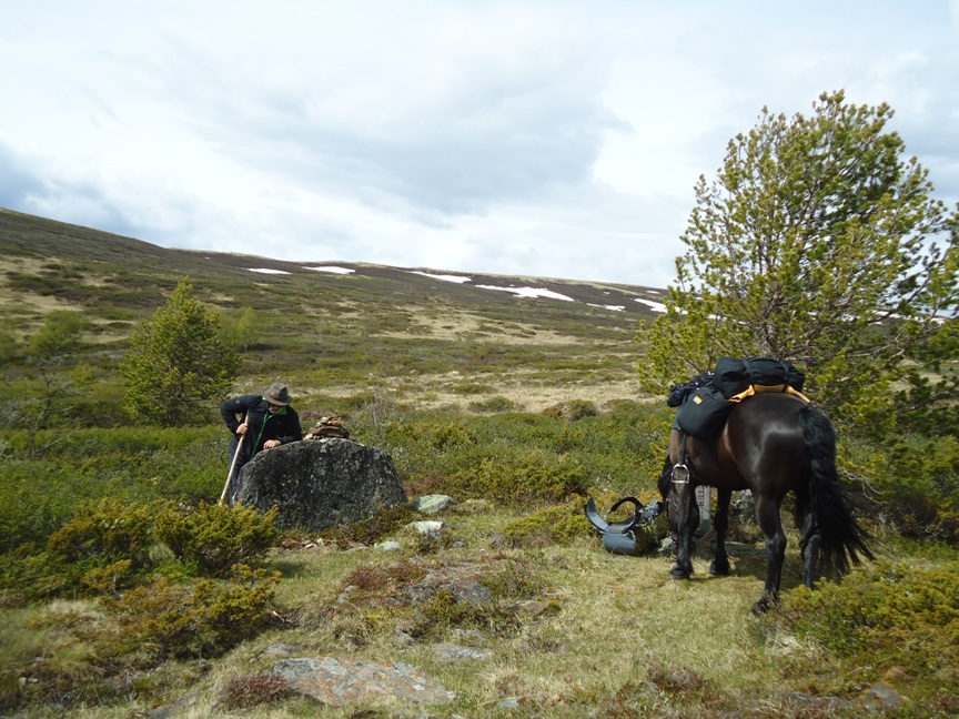Fra Budsjord begynner vi med å krysse en bekk og kommer inn på et kubeite. Frøya og jeg blir stående og vente på følget vårt, som lukker grinda etter oss. Kuene begynner å stimle mot oss og jeg føler meg utilpass. En av dem ser mistenkelig ut og jeg synes hun blir mer og mer grim i blikket. Når hun så senker hodet på en helt spesiell måte tar panikken meg. Jeg roper ut til Svein: -«Kom med staven! Kom med staven!» Jeg ser for meg at kua styrter inn i siden på hesten og synes Svein beveger seg som i sakte film, jeg får meg ikke en gang til å hoppe ned av hesten, jeg bare fryser til – men endelig når han fram og får kua på andre tanker, når det er et menneske imellom med stav i hånden. Jeg tror ikke den kua hadde så mye til overs for hester. Det er ikke alltid bare okser som kan være olme. Men takk og lov det gikk bra denne gangen også!