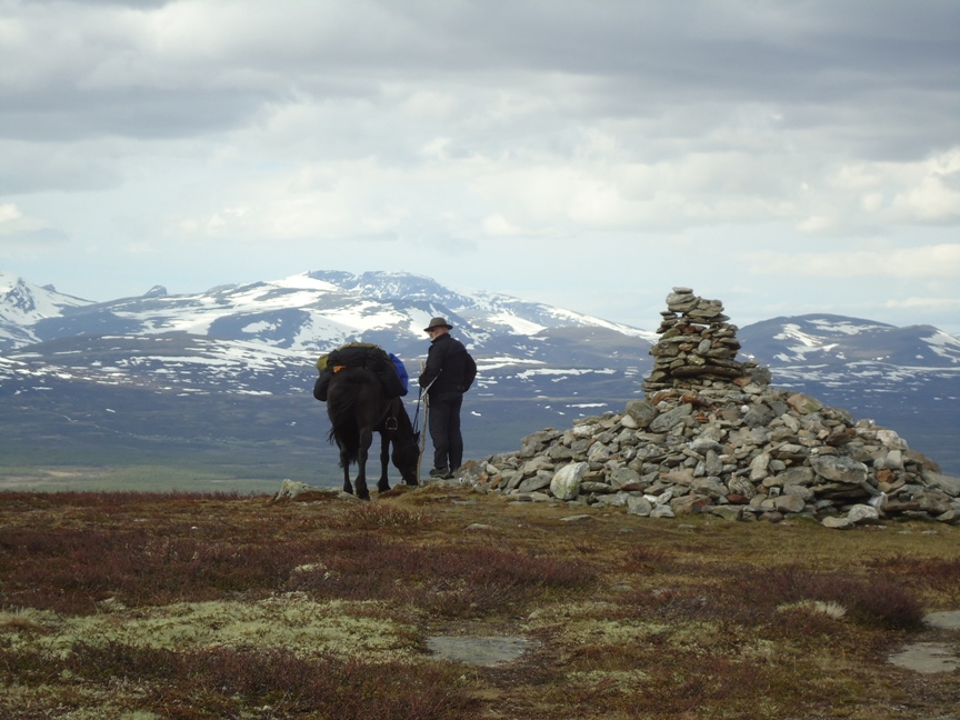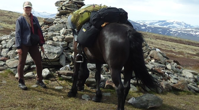 Vi kommer oss ut fra kubeitet og resten av turen er fin med sauer som beiter og vakker natur, det er god stigning oppover her og jeg tar ryggsekken til Svein opp på hesten. Litt ubehagelig å ri med diger ryggsekk, men det går da et stykke…