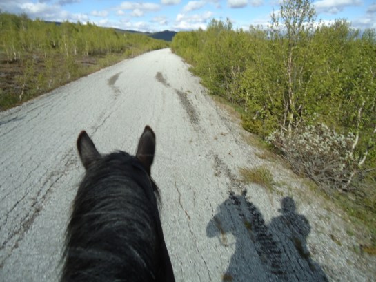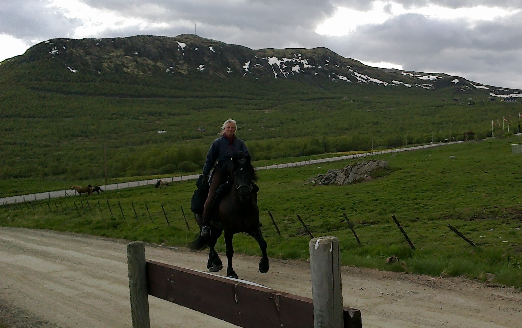 Svein starter i forveien denne morgenen og vi tar ham igjen litt lenger opp. Denne dagen blir det til at vi går litt i vårt eget tempo, det går jo fortere å ri enn å gå, og det er ikke alltid hensiktsmessig å slå følge hele veien. Så når jeg tar ham igjen blir vi enig om at jeg venter på ham litt lenger fremme. Som pilegrim er det ikke alltid man har lyst til å prate eller synes man har noe å si. Kanskje vil man bare gå i egne tanker, observere og kjenne på omgivelsene. Det blir en tøff men fin etappe med opphold hele veien, og gløtt av sol. Det er stedvis myr med tykke planker til å gå på, to i bredden på det meste, eller bare en. Der det ligger to i bredden finner Frøya ut at hun skal følge etter meg og gå oppå dem hun også. Hun er en intelligent hest. Men der det bare er en blir det vanskelig for henne å fa alle fire bena oppå og når hun trår i myra synker hun, så vi må gå fort fremover for å klare det. Det blåser sterk vind på toppen, så sterk at man kan lene seg inn i den og bli holdt oppe, alt blafrer så det nesten støyer. Her oppe vokser det bare lav og mose og en og annen krypende lyngvekst som klorer seg fast. Det ligger fortsatt snø her og der.