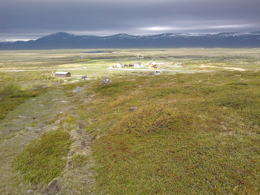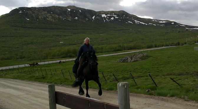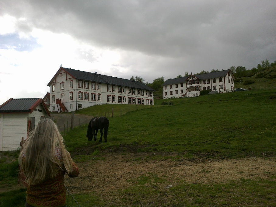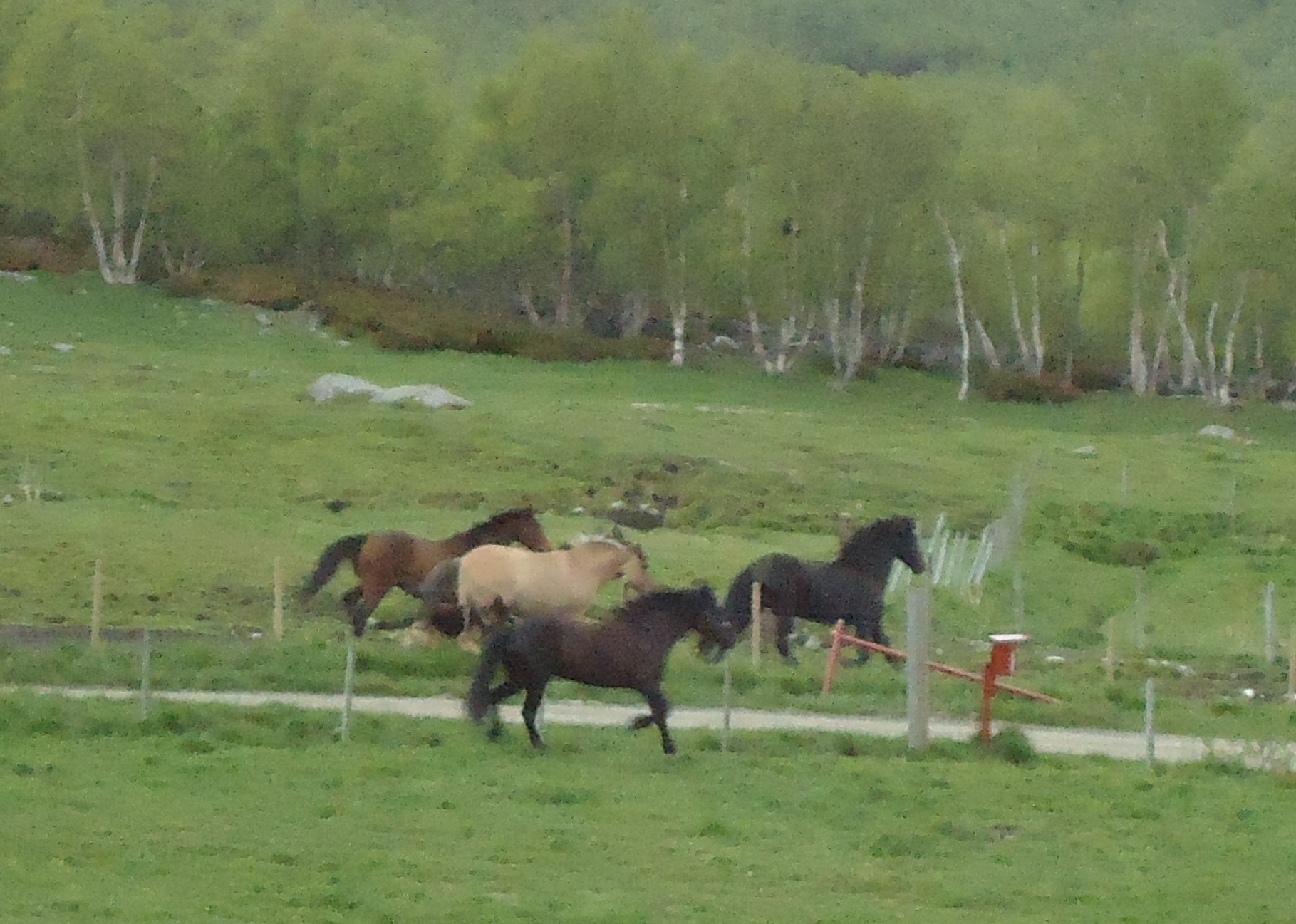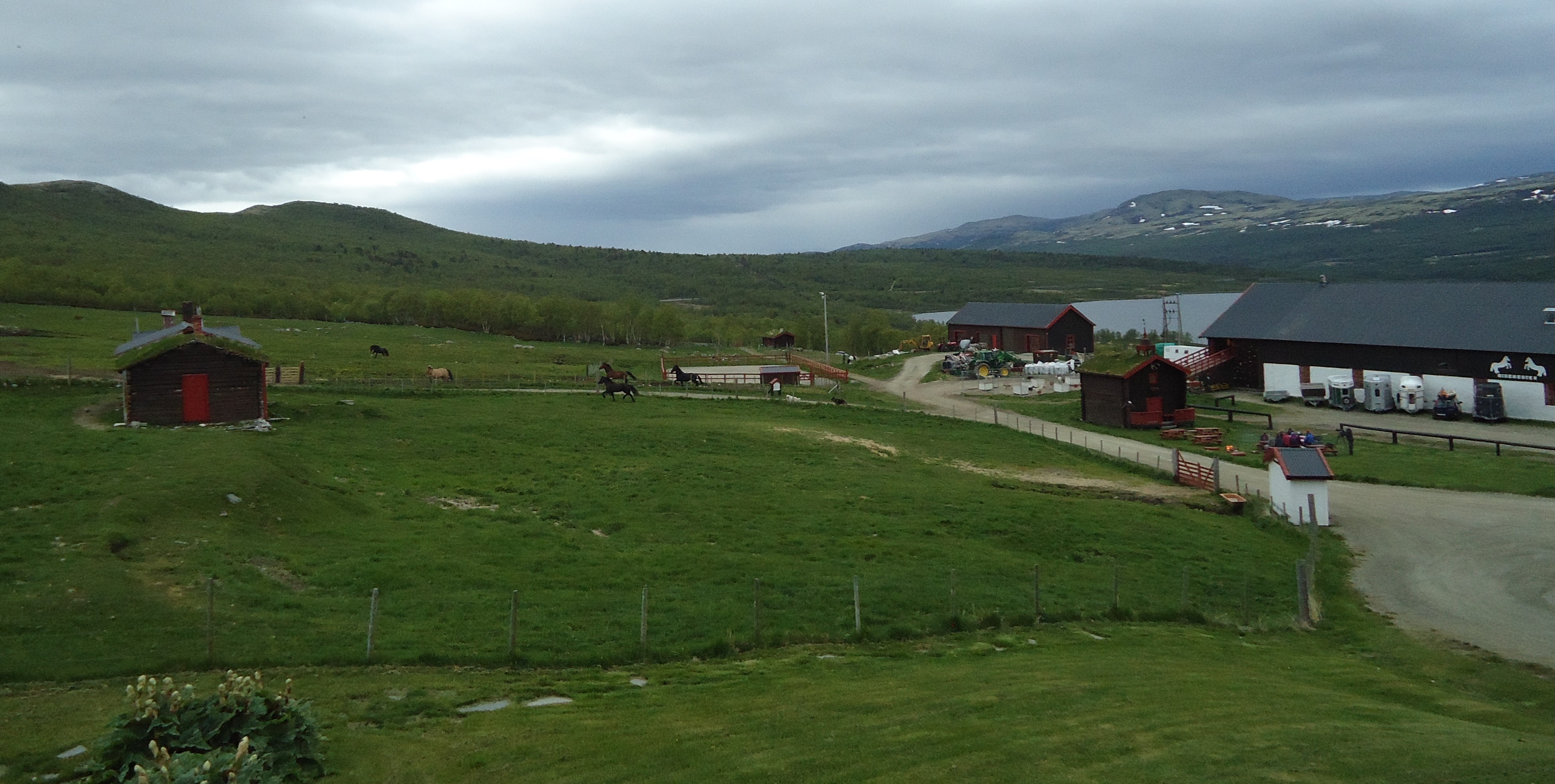 Vi ankommer Hjerkinn på St. Hansaften og Frøya får sin egen innhegning. Her kan man velge oppstalling, inne på boks eller ute på beite, og man betaler døgnleie. Jeg valgte beite og Frøya synes det var deilig å ha andre hester rundt seg igjen. Litt utpå kvelden kom en schäferhund og lekte med hestene, den løp frem og tilbake på utsiden av gjerdet og hestene fulgte etter i full gallopp. Frøya kastet seg inn i leken og zoomer du inn på bildene under kan du skimte schäferhunden. De holdt på lenge, og hadde det kjempegøy. Disse bildene er tatt fra hotellrommet, jeg hadde utsikt over beitet hvor Frøya gikk og kunne følge med på henne og se at hun hadde det bra.