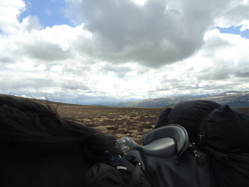 Det blir en fin etappe med sol hele veien. Mellom Fokstugu og Hjerkinn virket Frøya motløs, nærmest deppa. Men etter hviledagen på Hjerkinn med utsikt til hestekompiser, og selv om hun ikke hadde lyst til å dra derfra, virker hun ved godt mot denne dagen – selv om det heller ikke her er ett eneste grønt strå i sikte…