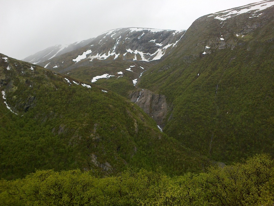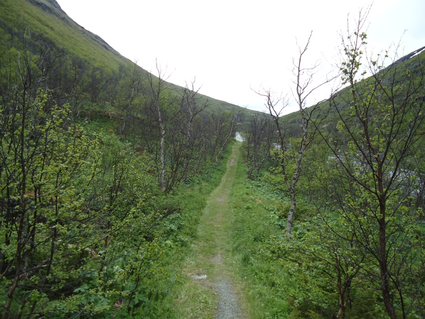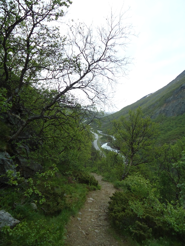Vårstigen skråner først svakt opp fra E6, men senere klatrer den oppover i høyden og fører inn i en skog av fjellbjørk, før den svinger av inne i skogen og blir virkelig bratt. Den bratteste strekningen består av noen partier med bart fjell, noe som kan by på utfordringer for hesten. Frøya har vært delvis barfot og uten boots de siste dagene, og var barfot på denne strekningen. Det ga det absolutt beste grepet. Hvordan det er å komme opp her med skodd hest på vått, glatt fjell vet jeg ikke.