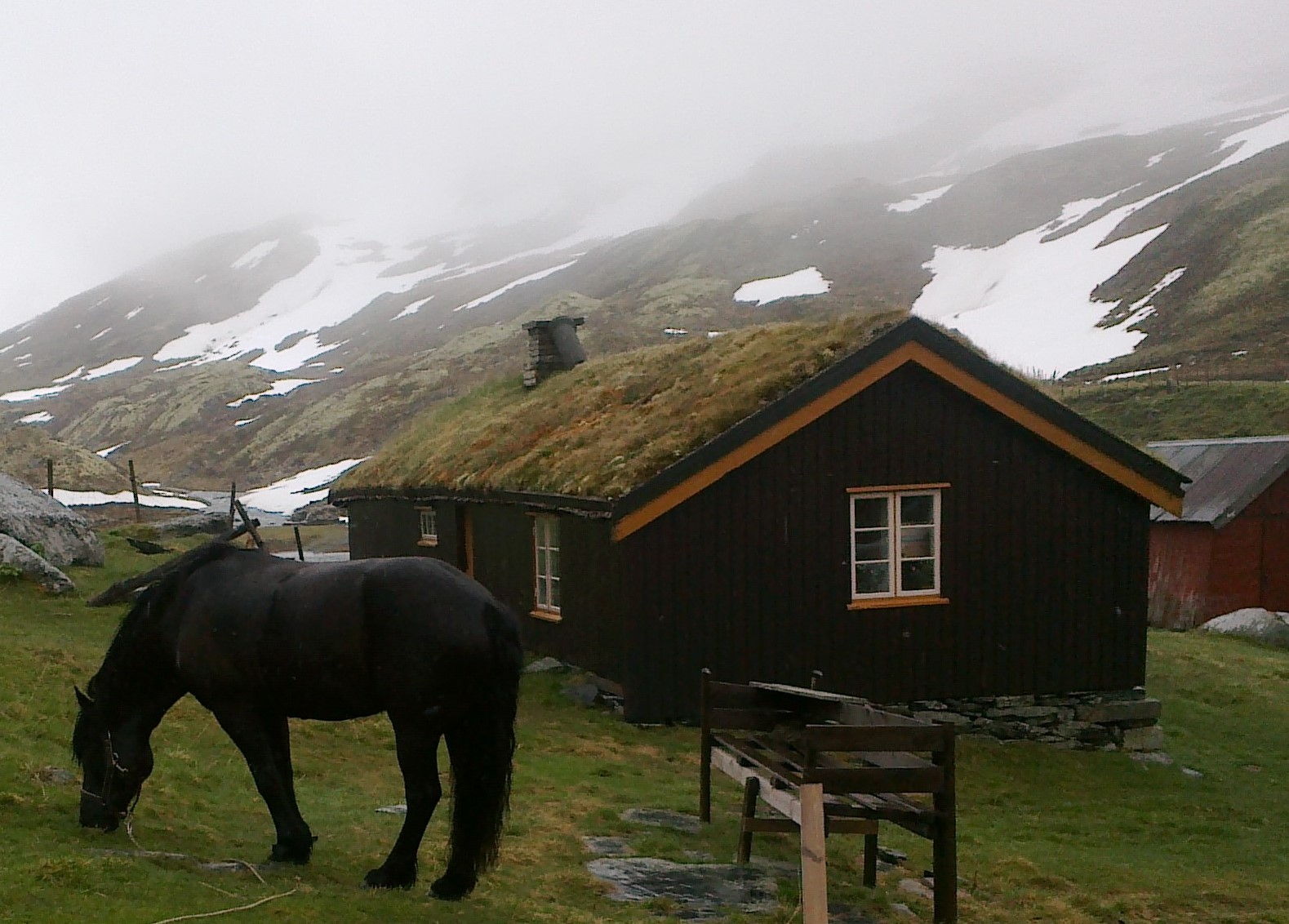 Frøya får gå og gresse mens jeg henter vann i fossen og begynner å varme vann til alle. Etter ca. en time kommer det tyske paret og etter nye 45 minutter kommer Svein. Da er det varmt vann og fyr på gassovnen. Frøya fryser og jeg låner en fillerye å ha over henne. Det er sur vind og fortsatt litt regn i luften. En trost har laget rede på benken inne på tunet (se bildet), helt under åpen himmel. For et sted å lage rede! Så lenge vi er der tør den ikke komme til ungene sine og jeg legger over en skiferstein for å beskytte dem mot regnet. Håper fuglen legger seg på dem når vi går inn. Jeg spør de andre hvordan de fant veien gjennom tåka, de svarer at det var ikke noe problem. De fulgte bare sporene etter hesten!