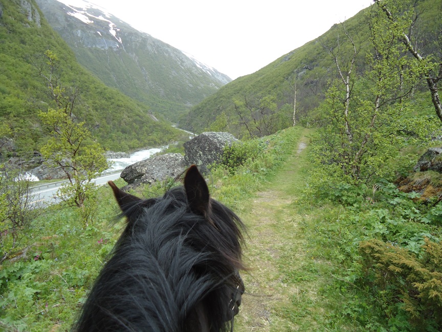 Vi møtte på flere langs leden her, et følge vandret bare langs vårstigen fra Nestasvollan ved E6 (i nord) opp til stien delte seg og ned igjen på E6 (i syd) mot Kongsvold. Det var også et tysk par som skulle samme vei som oss. Frøya og jeg nådde igjen Svein oppi bakken og dro forbi alle og opp det glatte fjellpartiet. Svein var rett bak meg og så hvordan hesten fotet seg opp det partiet. Han snakket om det i flere dager, for noen hadde ment at bare islandshester ville klare turen opp der, men den uttalelsen ble gjort til skamme. Det synet gjorde visst intrykk, og det kan hende jeg aldri hadde turt å ri der om jeg hadde sett det på film i forkant! Både jeg og hesten skjønte alvoret når vi merket hvor glatt det var, og jeg ropte «Kom igjen! Kom igjen! BRRAA!!» mens Frøya jobbet det hun kunne og klorte seg fast i høyt tempo. Vi greide det! For en flink hest jeg har 🙂