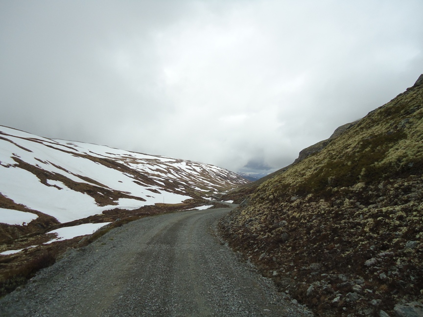 Når vi kommer opp er det tåke, regn og iskaldt. Det ligger en del snø og is og stedvis er leden helt dekket med underhulte isflak, som jeg er redd hesten kan trå igjennom og dermed skade seg. Pilegrims-merkene må være gjemt under snøen eller veltet, for flere steder innover er de helt usynlige. Det finnes ikke merking rundt oss noe sted. Når tåka tetner befinner jeg meg i en situasjon som er rent lotteri. Jeg prøver å se for meg hvor det er naturlig at leden går, og så bare bestemme meg for å styre hesten rett dit. Jeg prøver å ringe Svein for å høre hvordan det går med ham, men det er null dekning her oppe. Det er isregn og vind og det er bare å gå på. Plutselig rir jeg forbi et merke som ligger på bakken og skjønner at jeg har «gjettet» riktig. For en lettelse! Etter hvert letter tåken og stien blir til vei, og så en enda bredere vei, og saken er biff og resten er bare blåbær!!
