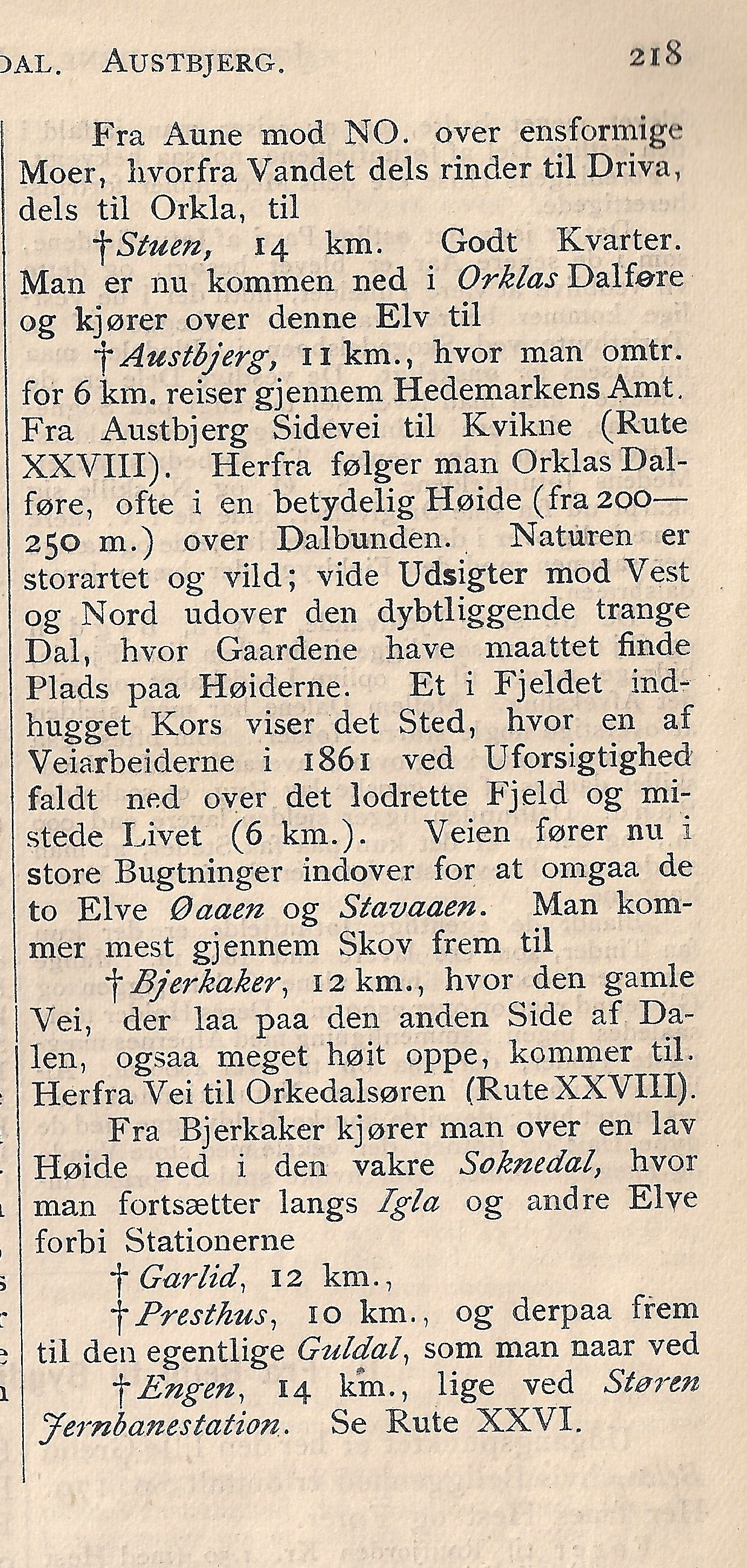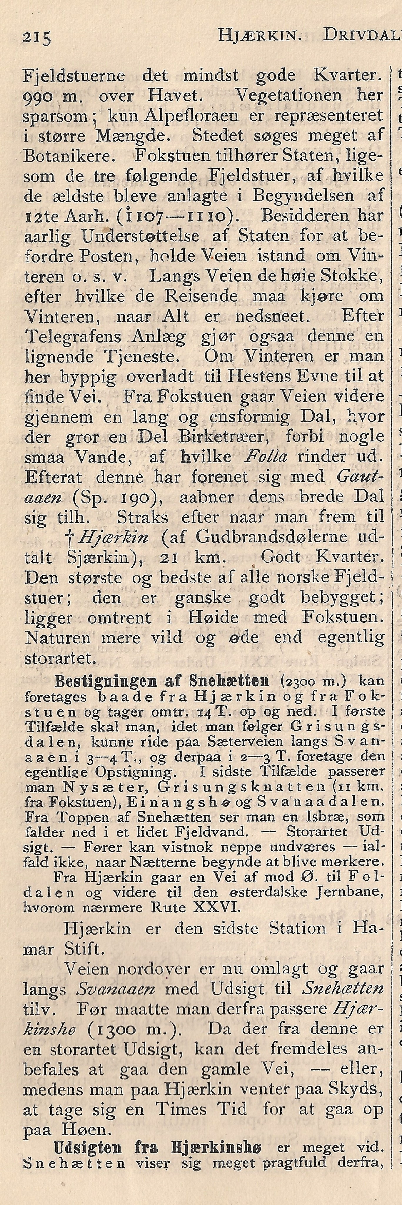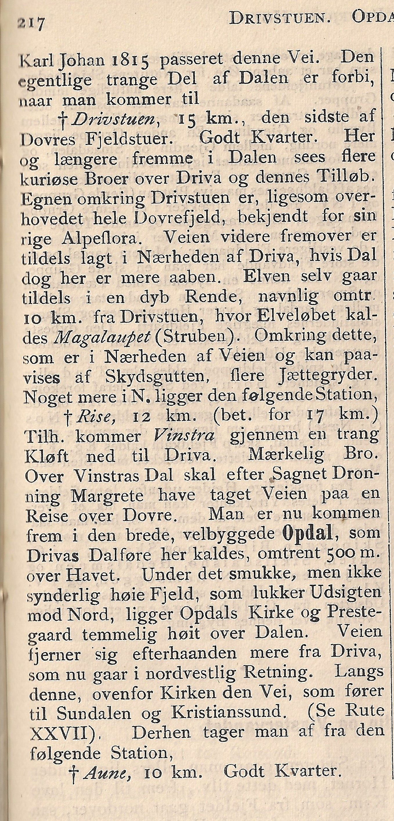 For den spesielt interesserte: Nedenfor utsnitt fra «Reisehaandbog over NORGE» fra 1881 av Dr. Yngvar Nielsen, som beskriver reisen fra Hjerkinn mot Kongsvoll og opp vårstigen – en lesvedrig skildring fra 1881 som viser hvor vanskelig og farefull denne strekningen var, og hvor avhengig man stedvis var av hestens evne til å finne vei:
