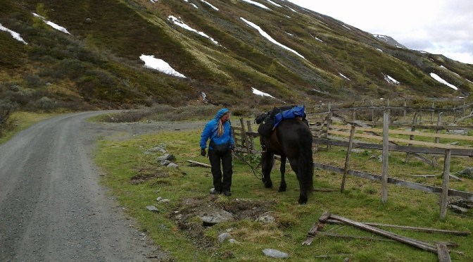 Vi var framme på Smedgarden camping litt over 9 på morgenen, men det var så velsignet behagelig temperatur og så velsignet koselige innehavere, og vi ble så godt tatt imot, at vi bestemte oss for å bli der den dagen. Vi leide hytte og bestilte masse mat. Nøt solen og at vi «hadde overlevd». Frøya virket fin og i god form, sikkert godt å få varmet den svarte ryggen sin i solen. Vi fikk en egen søplesekk til å ha hestemøkka i, for den ville vertinna ha på rosene sine. Det var her vi fikk høre om de to tyske damene som hadde kollapset i en av hyttene oppi skogholtet, uten å vite at det var 200 meter fra oppvarmet seng og dusj, og de stakkarene som måtte reddes ned med helikopter. Sommeren var uvanlig sen i fjellet dette året, og bare noen få sauer var blitt sluppet, ingen kalver eller kviger – det var for kaldt for dem – og det var straks juli! Utrolig. Tenker at det er godt vi kom gjennom det med liv og helse i behold. Dovre er ingen spøk. Forresten har de en telefonkiosk av det gode gamle slaget her på Smedgarden camping, som fortsatt er i drift!