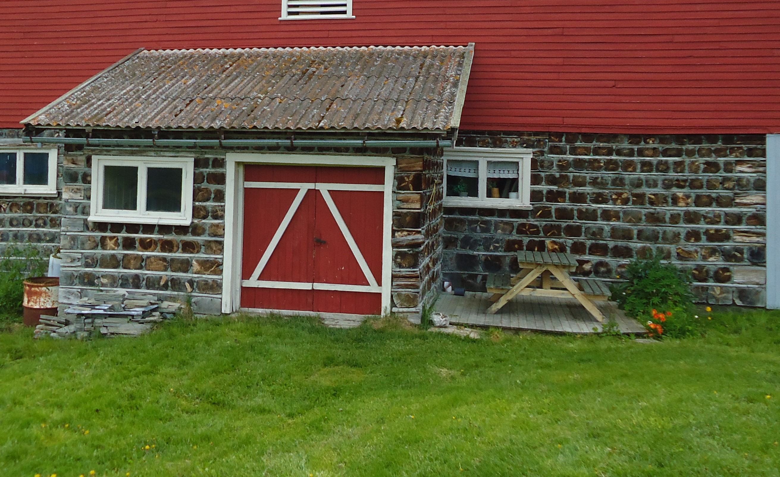 Brisen som møtte oss da vi kom ned i bygda var bare ren sommer. Så snill. Så godt. Jeg er nok ikke noe fjellmenneske. Følte meg litt som Frøya der oppe, tom i blikket. Vakkert på sin måte, vilt og åpent, men så goldt og ugjestmildt. Jeg er nok ikke noe vintermenneske lenger heller. Det er godt å komme ned til dyrka mark og til sivilisasjonen og sommeren. Leden går gjennom noen gårdstun, forbi jorder og enger, og gjennom et skogholt før man kommer ut på Smedgarden camping. Det tyske paret startet etter oss men tok oss igjen nede i bygda. De hadde store, tunge sekker begge to men du verden som de gikk med taktfaste steg, der de fulgte sitt stramme tidsskjema. Så forresten en interessant låvevegg der trestubber ligger på tvers, vet ikke hva den byggestilen heter, men veggen var fin: