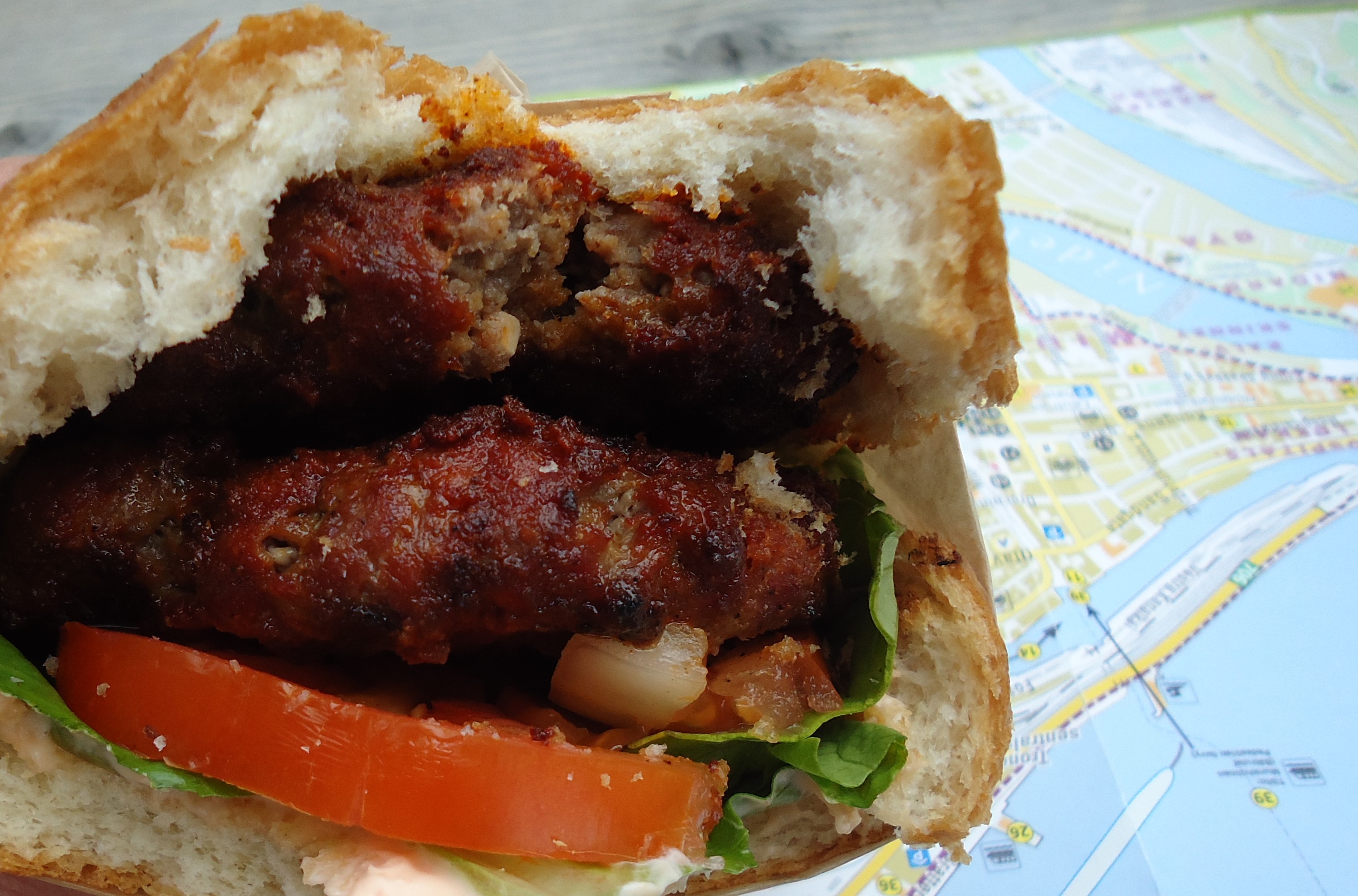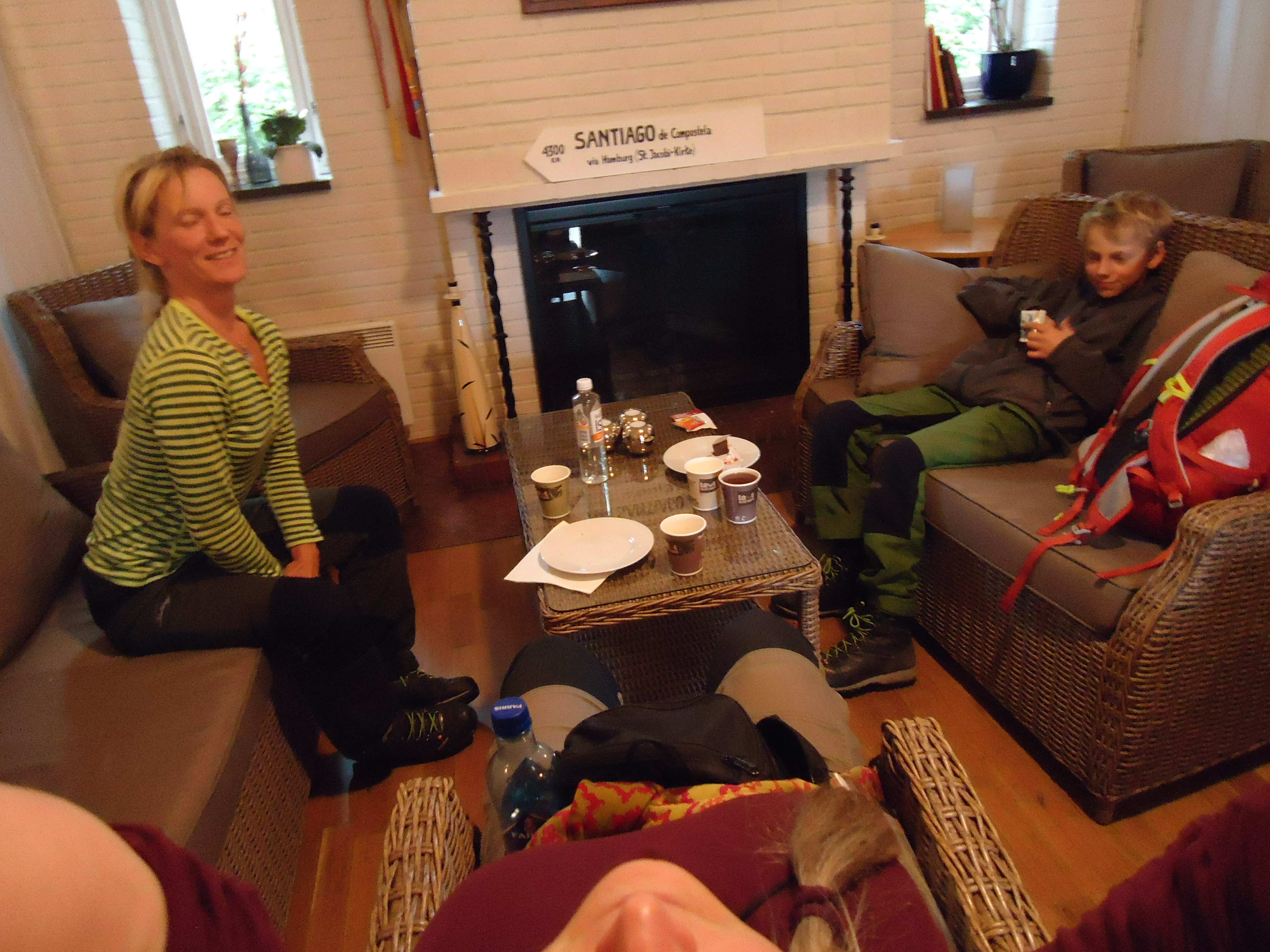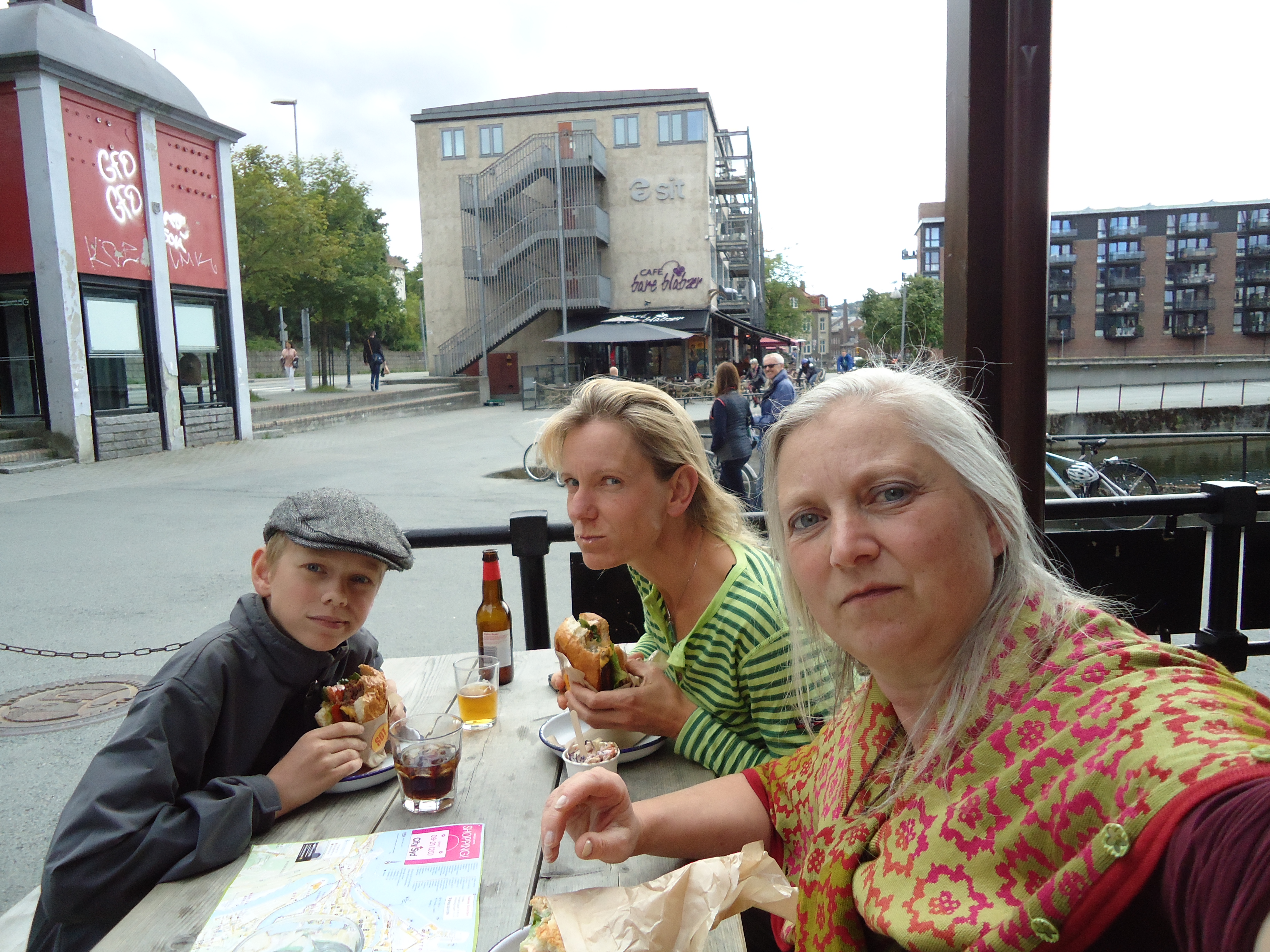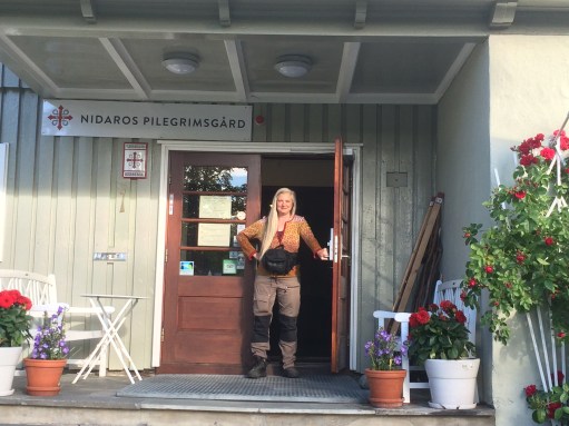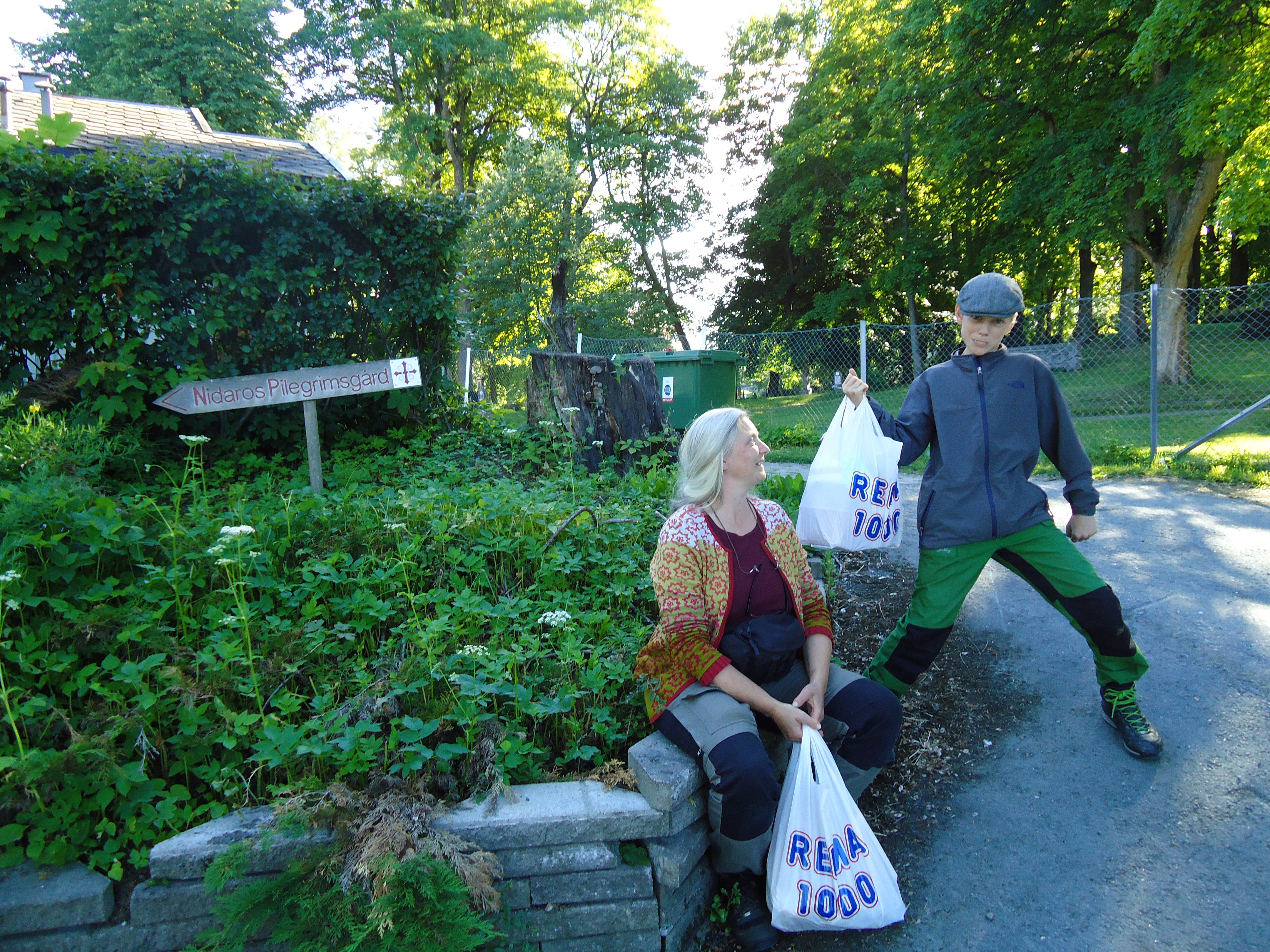 Vi innkvarteres på Nidaros pilegrimsgård (vi har forhåndsbooket, det er lurt spesielt i høysesongen), og jeg finner en seng med utsikt over Nidarosdomens mektige steinvegger skimtvis mellom bladverk og gamle trestammer. Vi får vafler og kaffe. Pilegrimer blir alltid tatt godt imot. Så bærer det ut i byen, for å feire at vi er i mål. Og Trym, han får fylt magen med belønningen han har drømt om på hele vandringen…