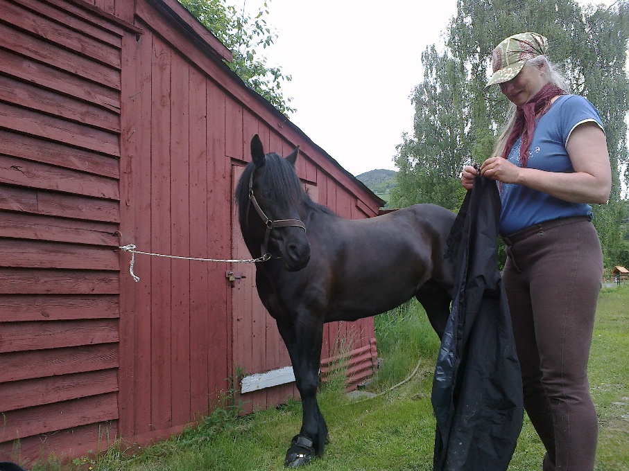 Frøya stelles og gjøres klar til dagens vandring. Hun har fortsatt flette i halen, som hun fikk av den lille jenta i Fåberg.