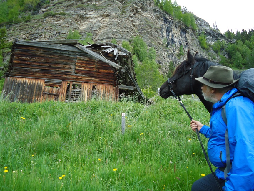 Dagens etappe starter med en bratt stigning i høyt gress opp et jorde i regnvær. Stråene henger tunge av regnvann og slipper det gjerne på oss når vi stryker borti. Den nyankomne pilegrimen har en altfor tung sekk men har igjen å oppdage det selv. Han sliter opp den bratte bakken. Jeg prøver i solidaritet å leie hesten, og gå til fots som ham, men hesten går hele tiden fortere enn meg og jeg sklir i søla, så jeg gir opp solidariteten og stiger opp på hesten igjen.