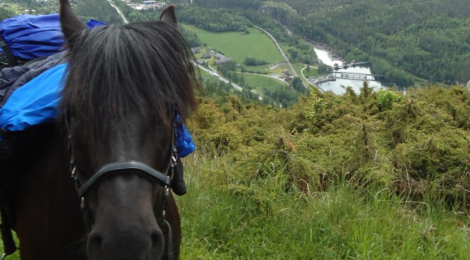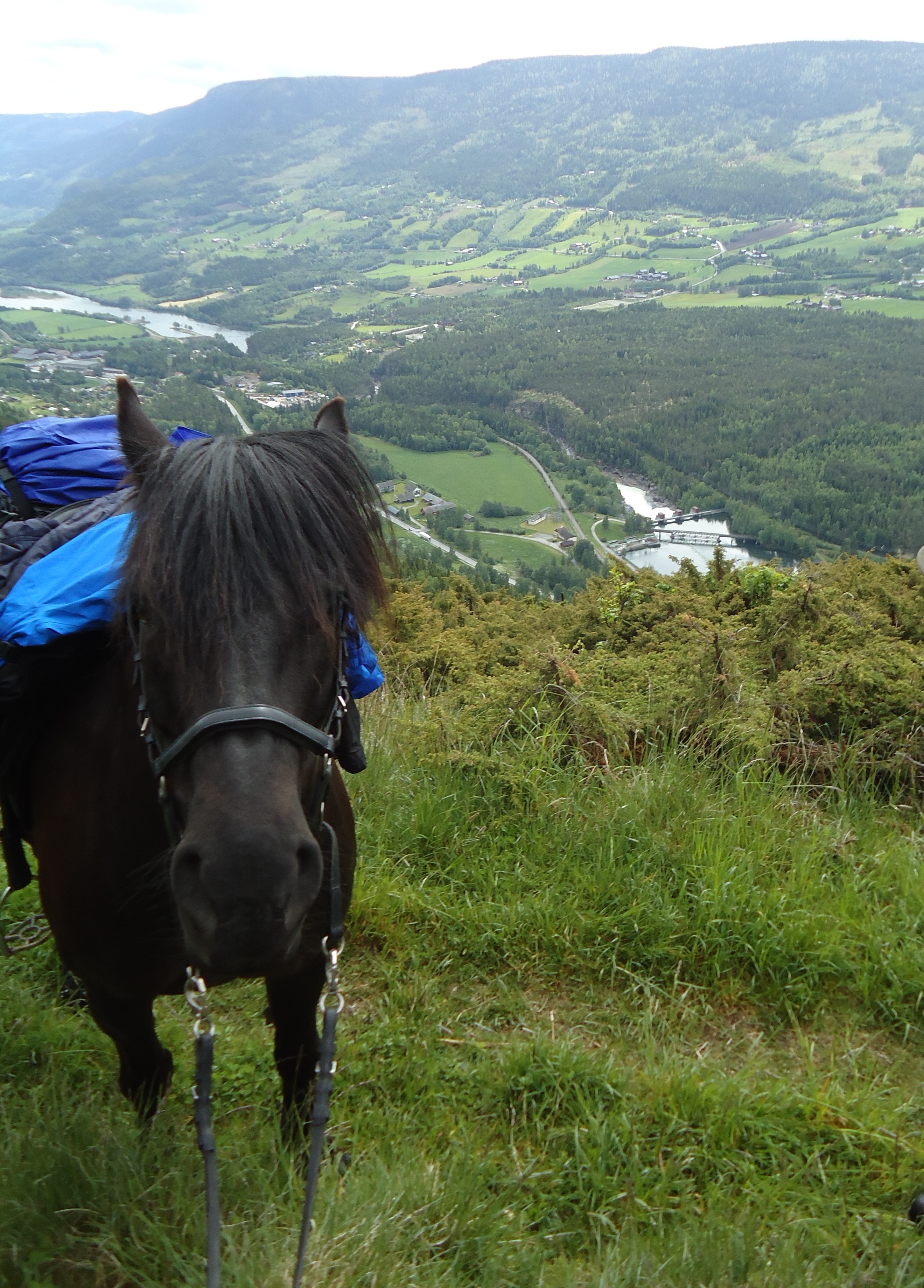 Fra setra og videre er det hele veien farbart med hest helt til Kvam, men det er stedvis som å gå på smale berghyller, sånn føles det. Jeg tør i alle fall ikke å ri her, og leier Frøya langs de smaleste og bratteste partiene.